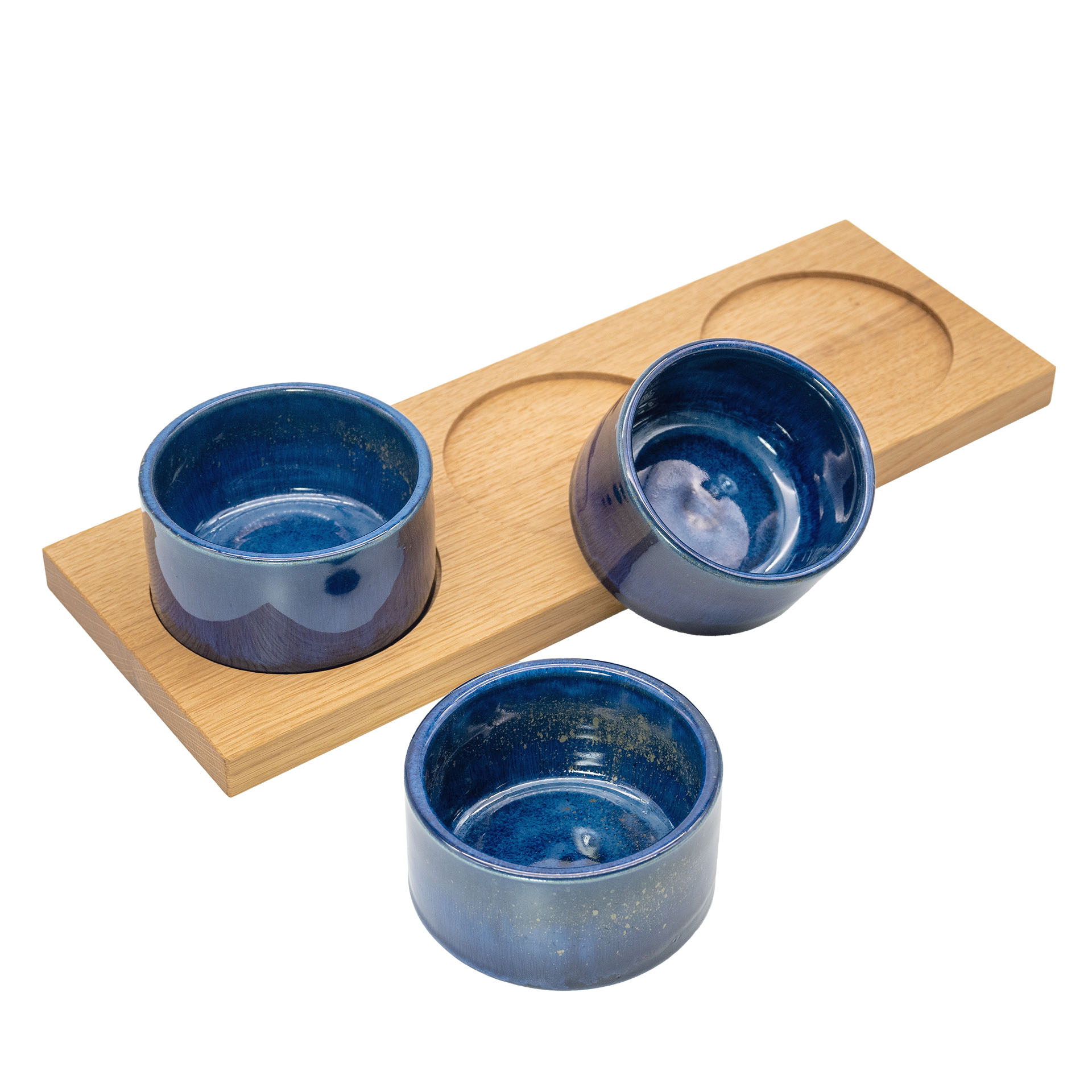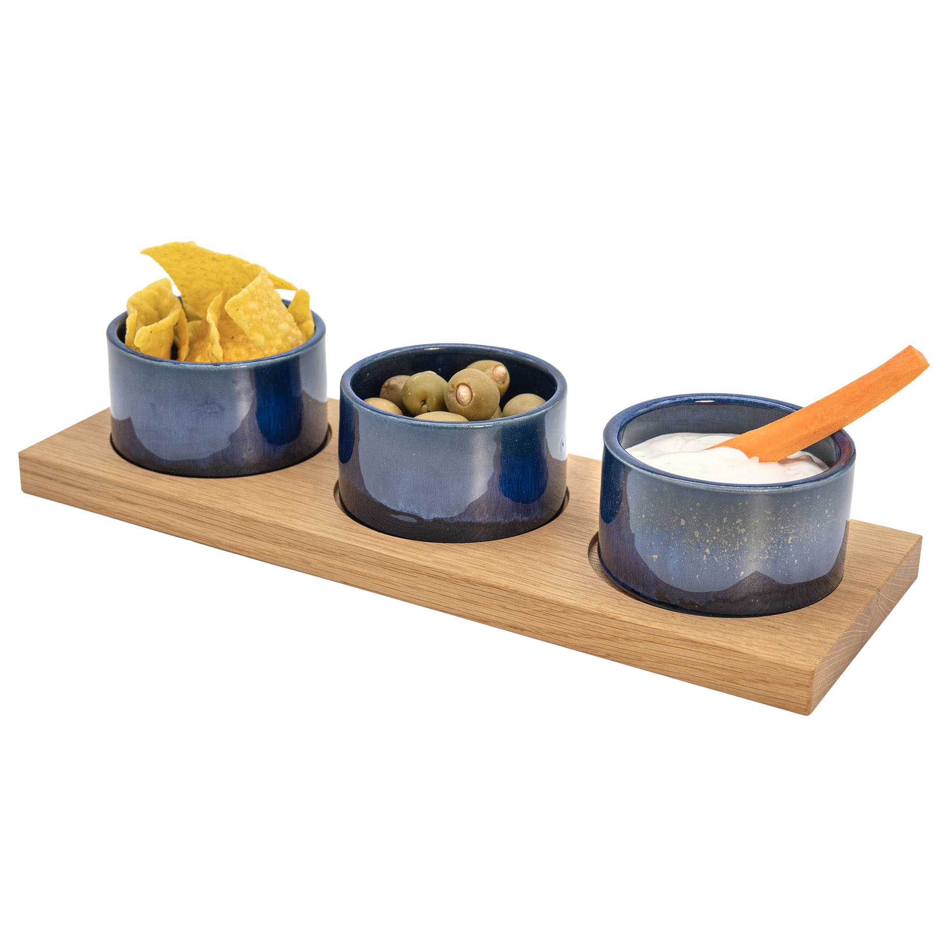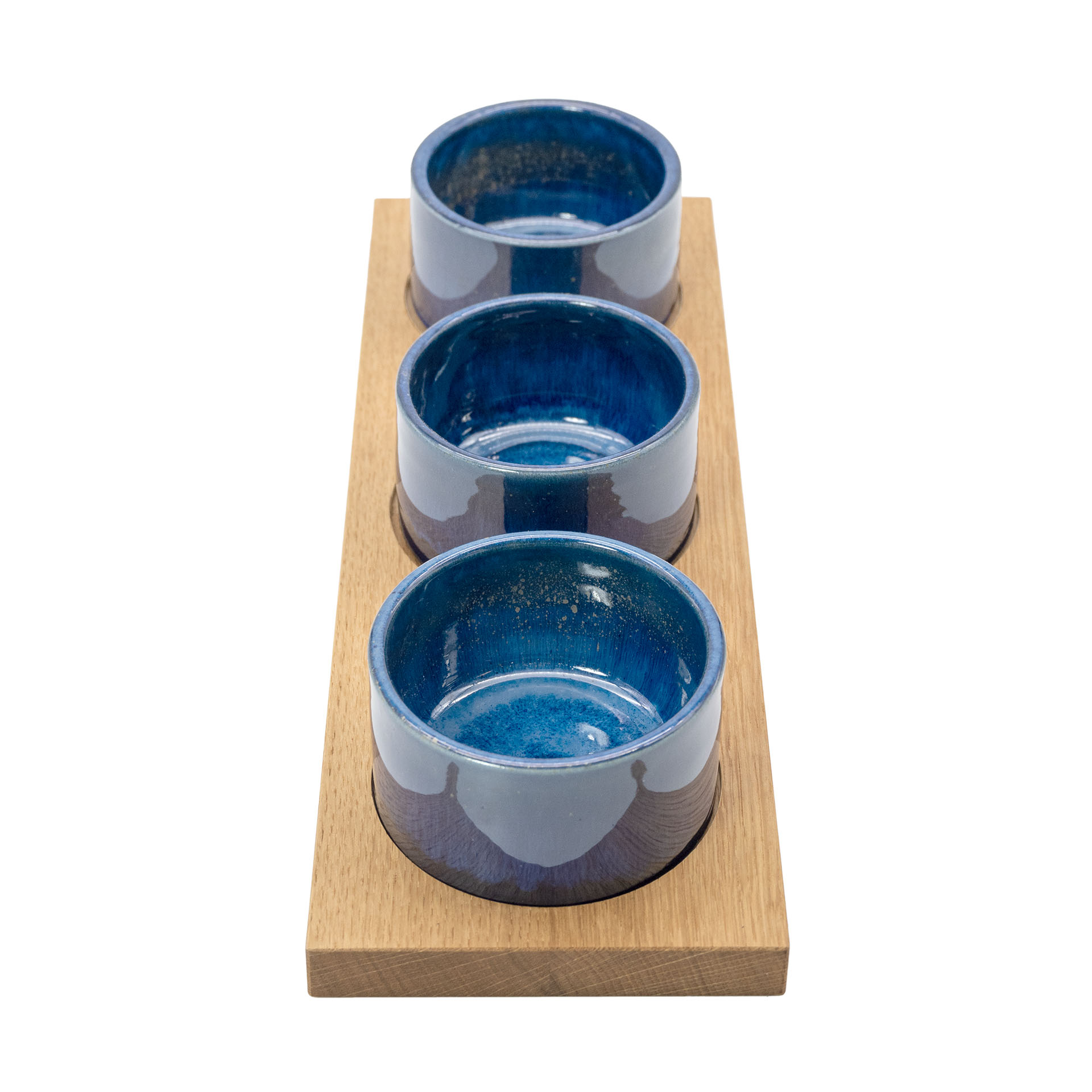 Handgemachte Dipschalen aus Steinzeug aus unserer Keramikwerkstatt in Bethel. Stilvoll präsentiert auf Servierbrettchen aus massivem Eichenholz.