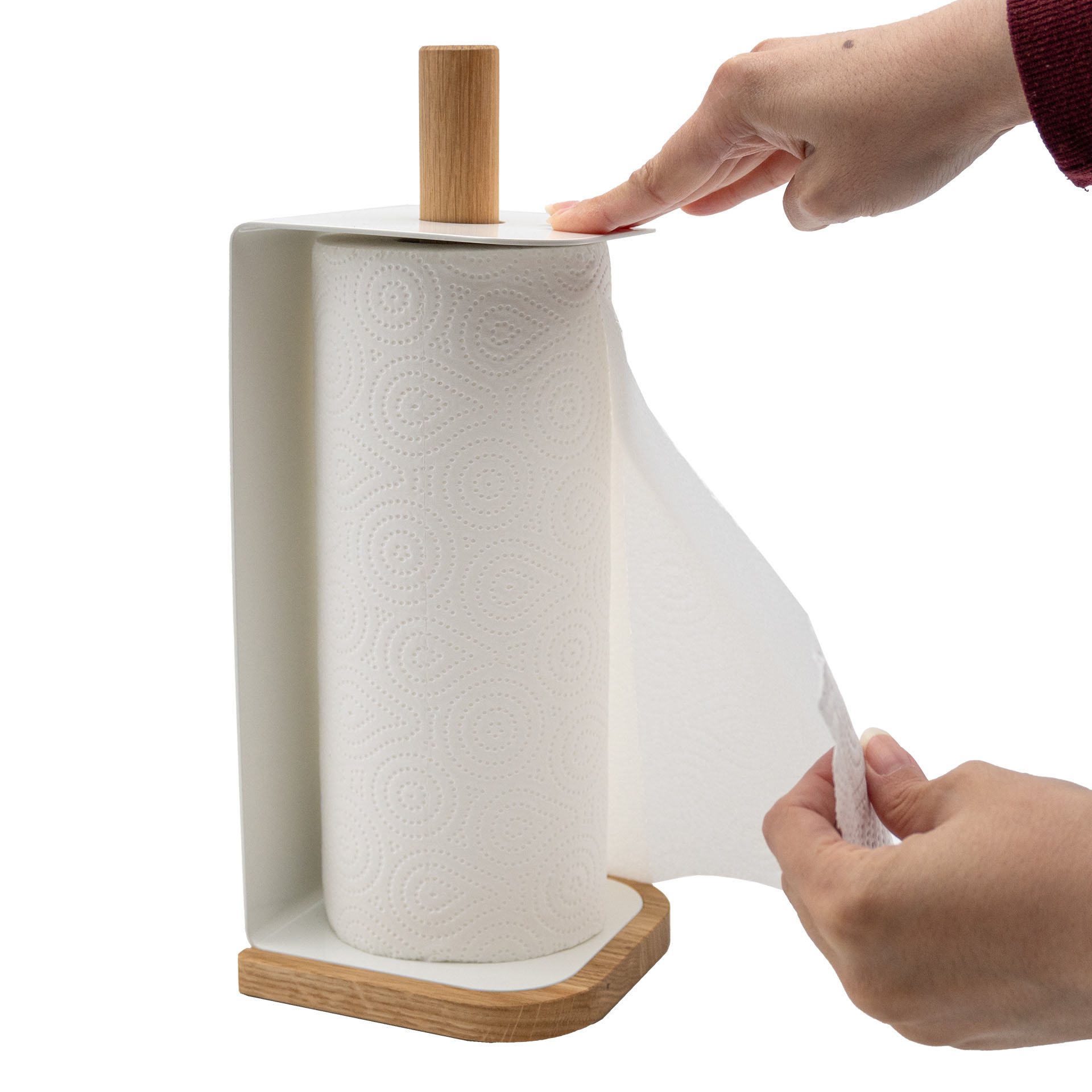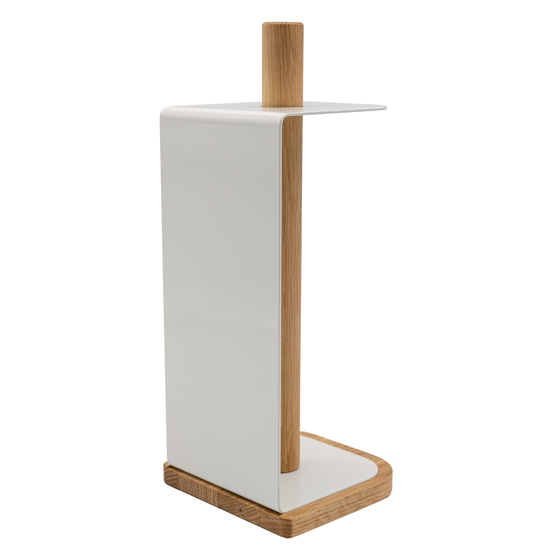 Stylische Küchenhilfe mit Funktionalität. Hergestellt aus Eichenholz und weiß pulverbeschichtetem Metall in schlichter nordischer Formensprache, mit Platz für Standard Küchenrollen. Einfach den Mittelstab herausdrehen und die Küchenrolle einlegen.